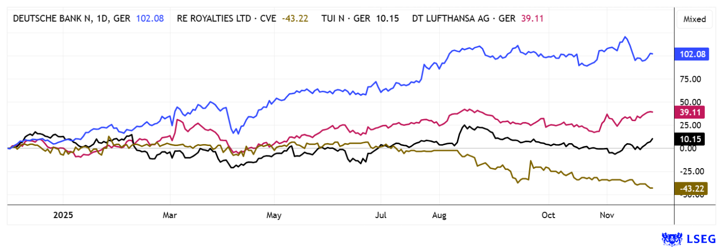 GreenFinance ist ein erwünschtes Thema, aber am Kapitalmarkt unterrepräsentiert. RE Royalties schließt hier eine entscheidende Lücke, indem das Unternehmen wiederkehrende Royalty-Einnahmen aus erneuerbaren Projekten generiert und zugleich Investoren planbare Ausschüttungen bietet, ein Nischen-Modell mit Potenzial für deutliche Bewertungssteigerungen. Parallel dazu zeigt die Deutsche Bank neue Dimensionen auf und auch Lufthansa und TUI kommen in ihrem Umbau voran.