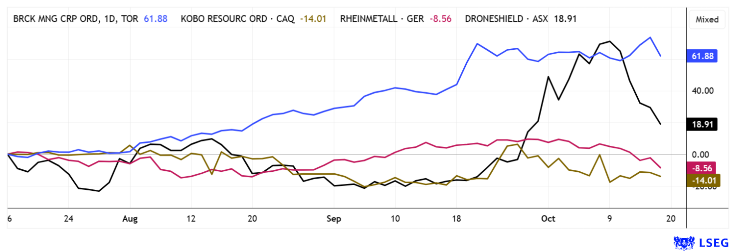 Gold bleibt trotz des stabilen Aufwärtstrends ein volatil gehandeltes Asset. Das zeigte sich in der letzten Woche. Kurzfristige Schwankungen von 3 bis 5 % waren keine Seltenheit, bieten aber spekulativen Anlegern attraktive Einstiegs- und Gewinnchancen. Trendfolgend haben große US-Investmenthäuser ihre Prognosen für das gelbe Metall angehoben: Goldman Sachs erwartet bis Ende 2026 etwa 4.900 USD je Unze, die Bank of America nennt zum ersten Mal die 5.000 USD-Marke. Spannend ist, wie kleine und große Goldtitel wie Kobo Resources oder Barrick Mining abschneiden. Keine gute Woche hatten zuletzt Rheinmetall und DroneShield. Denn während sie nach wie vor vom globalen Aufrüstungstrend profitieren, kamen die Kurse erst mal heftig unter Druck. Was jetzt tun?