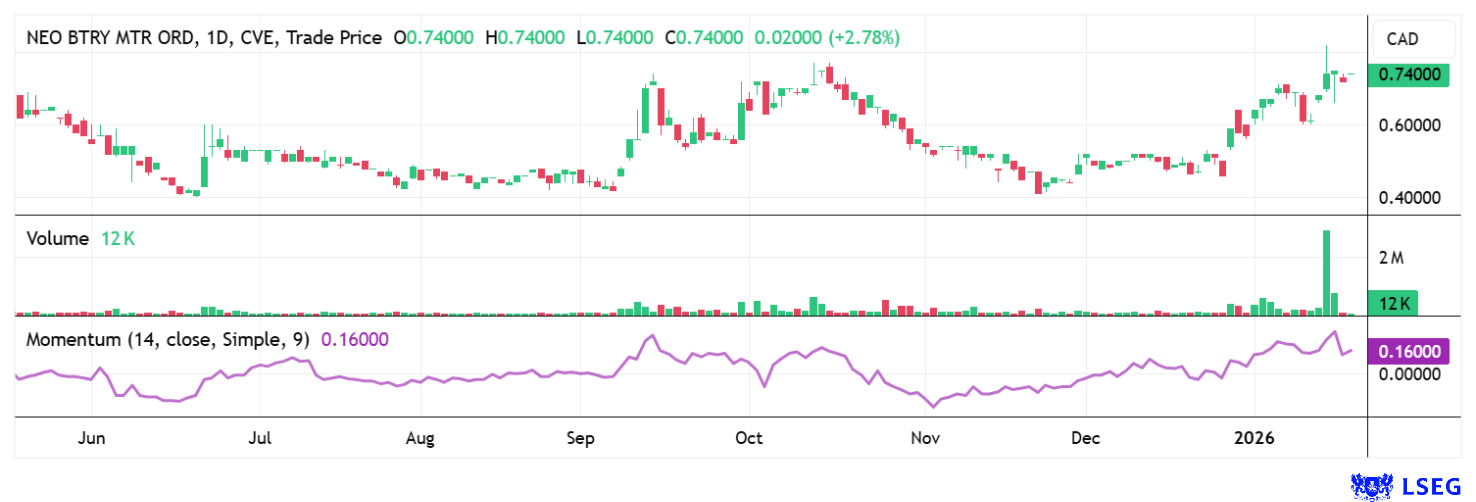 Langfristiges Differenzierungsmerkmal bleibt die Kombination aus eigener Materialentwicklung und zunehmender Fertigungstiefe über verschiedene Zellformate hinweg. Diese Integration verschafft NEO Battery insbesondere in gewichtssensitiven Nischenanwendungen einen klaren Wettbewerbsvorteil. Zur Finanzierung des weiteren Ausbaus hat das Unternehmen Anfang 2026 eine vollständig platzierte Kapitalerhöhung über rund 7 Mio. CAD abgeschlossen. Die Mittel fließen vor allem in zusätzliche Produktionsanlagen sowie in die Erweiterung der Zellformate und schaffen die Grundlage für mittelfristig steigende Umsätze. Angesichts der jüngst dynamischen Entwicklung markiert die aktuelle Marktkapitalisierung von 106 Mio. CAD eher den Ausgangspunkt für deutlich höhere Bewertungsniveaus. Technisch wäre die Fortsetzung des Ausbruchs über 0,80 CAD ein starkes Kaufsignal.