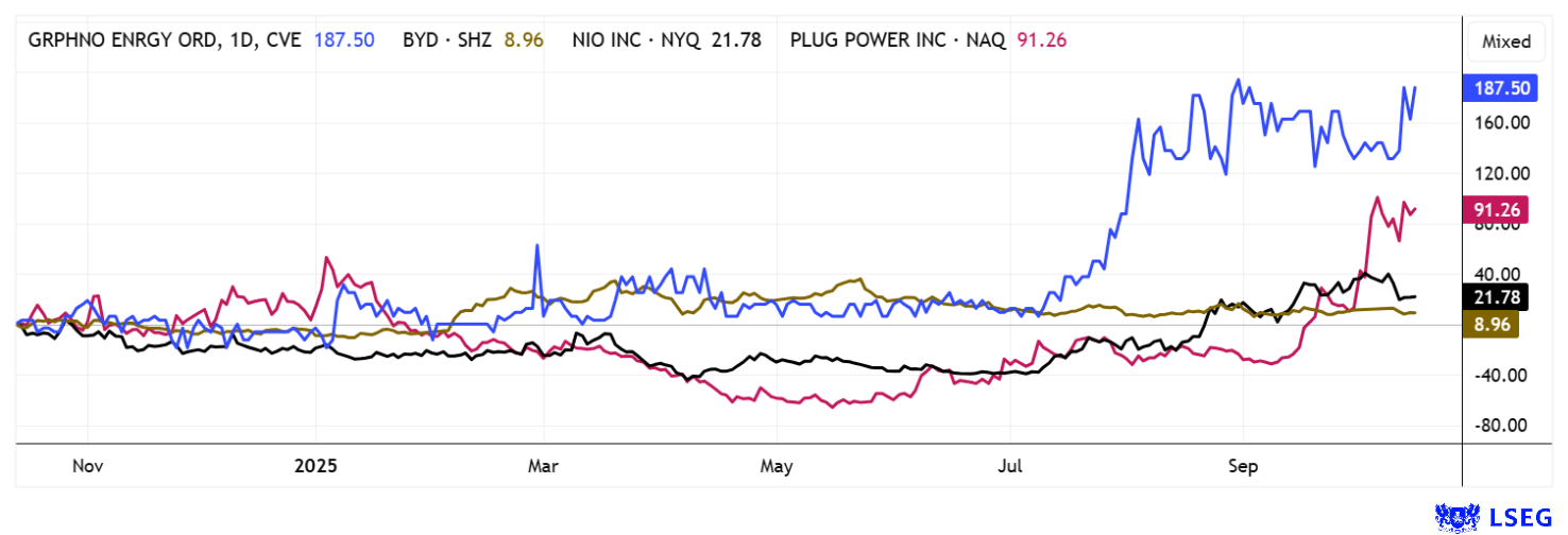 Graphano Energy Ltd. | CA38867G2053 , BYD CO. LTD H YC 1 | CNE100000296 , NIO INC.A S.ADR DL-_00025 | US62914V1061 , PLUG POWER INC. DL-_01 | US72919P2020
