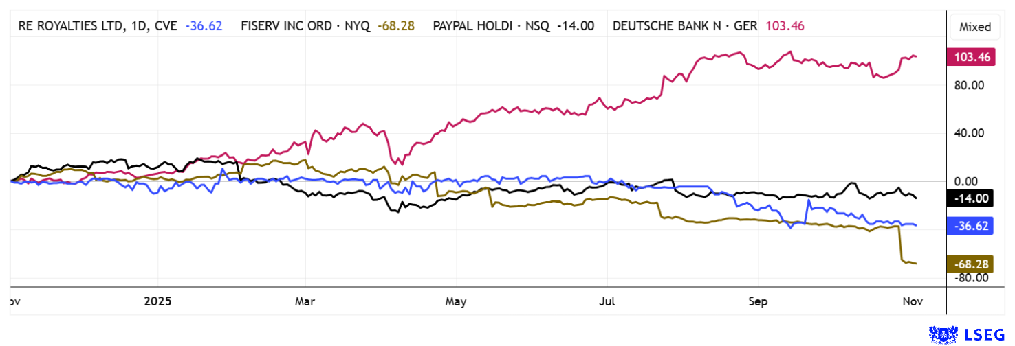 Green Finance ist ein erwünschtes Thema, aber am Kapitalmarkt unterrepräsentiert. RE Royalties schließt hier eine entscheidende Lücke, indem das Unternehmen wiederkehrende Royalty-Einnahmen aus erneuerbaren Projekten generiert und zugleich Investoren planbare Ausschüttungen bietet, ein Nischen-Modell mit Potenzial für deutliche Bewertungssteigerungen. Parallel treiben etablierte Akteure wie Deutsche Bank, PayPal und Fiserv nachhaltige Finanz- und Payment-Infrastrukturen voran, das Thema ESG erscheint aber nur am Rande.