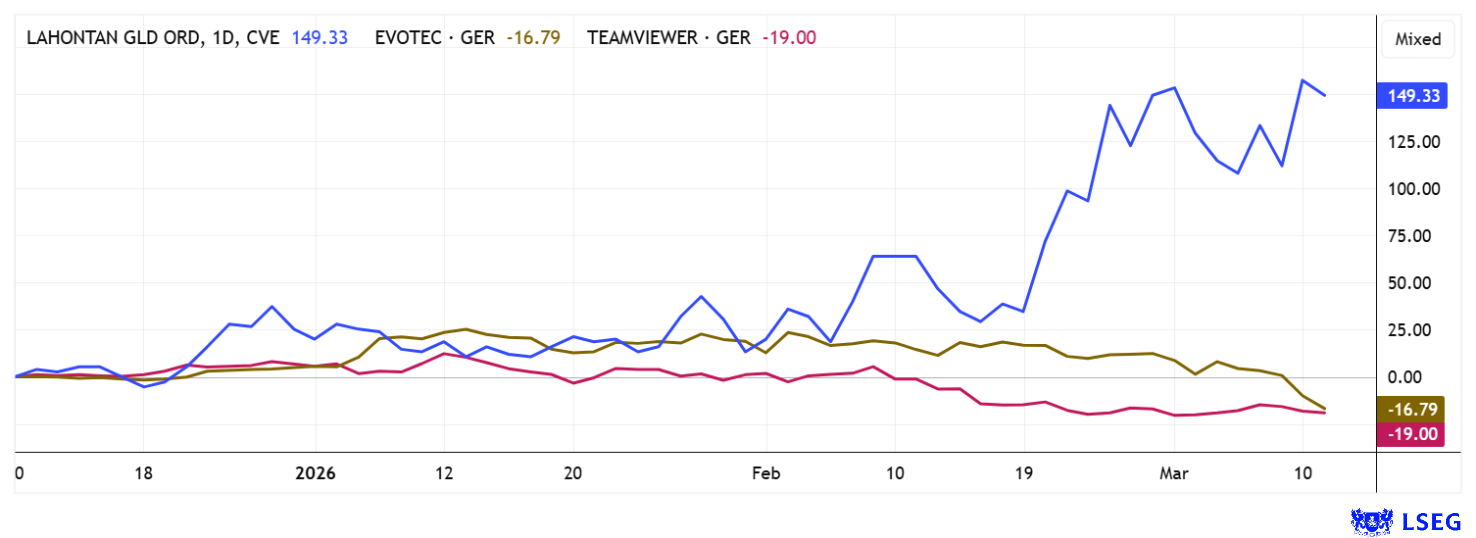 Die Börse macht derzeit keine Gefangenen. Im Fall von Evotec muss der Kurs der schlechten operativen Performance seit 2024 Tribut zollen. Bei TeamViewer vergnügen sich die Shortseller seit einiger Zeit. Auch hier gibt es einige Probleme mit den jüngsten Akquisitionen. Sonnenschein hingegen verbreitet Lahontan Gold, denn auf dem Projektgelände West Santa Fe konnten vielversprechende Goldfunde vermeldet werden. Die Aktie jubiliert und hat sich in 3 Monaten jetzt mehr als verdoppelt.