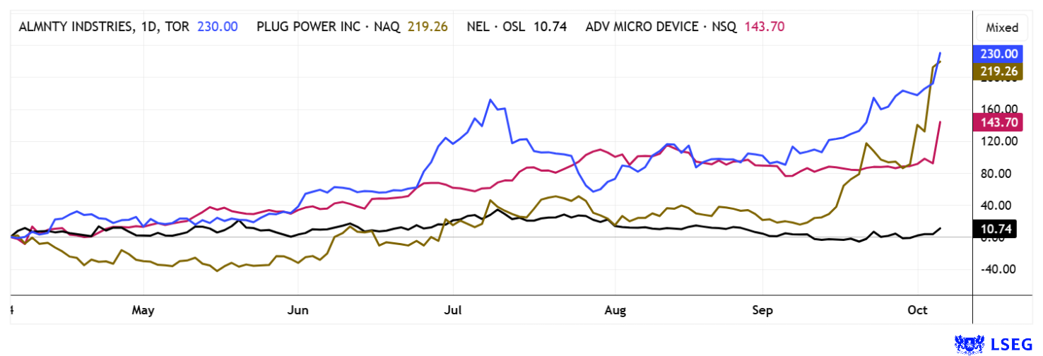An den Finanzmärkten herrscht Hausselaune. Aber nicht alle Titel verhalten sich wie Almonty Industries, wo es um eine reine fundamentale Neubewertung geht. Bei den Wasserstofftiteln gab es nach dem Goldrausch in 2020/2021 eine langanhaltende 95 %-Korrektur. Für den US-Branchen-Primus Plug Power bedeutete dies einen Abverkauf von über 12 USD auf tiefe 0,75 USD EUR. Im Mai war dann Schluss und der Titel stieg raketenartig auf gestrige über 4,75 USD – eine Verfünffachung in nur 4 Monaten. Auch Nel ASA hat diesen Weg beschritten, auch hier gestern die 15 %-Wende von unten. Diese extremen Bewegungen zeugen von sehr hoher Liquidität in den Märkten. AMD überrascht mit einem Deal mit OpenAI – auch das ist gut für 25 % Anstieg. Der Helium-Ballon bekommt immer mehr Auftrieb. Hier ein Überblick zum Geschehen.