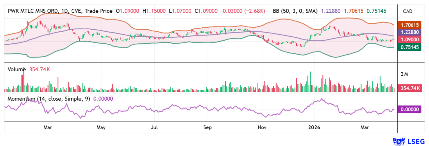 Mit einer aktuellen Marktkapitalisierung von rund 250 Mio. CAD befindet sich Power Metallic schon unter den fortgeschrittenen Explorationsunternehmen, denn maßgeblich ist der bereits signifikante Metallbestand durch kontinuierliche, geologische Bohrerfolge. Analysten sehen wegen der hohen Projektqualität eine deutliche Diskrepanz zwischen Unternehmenswert und Potenzial und erwarten daher eine Neubewertung mit Fortschritt der Ressourcenschätzung und der geplanten Wirtschaftlichkeitsstudie.