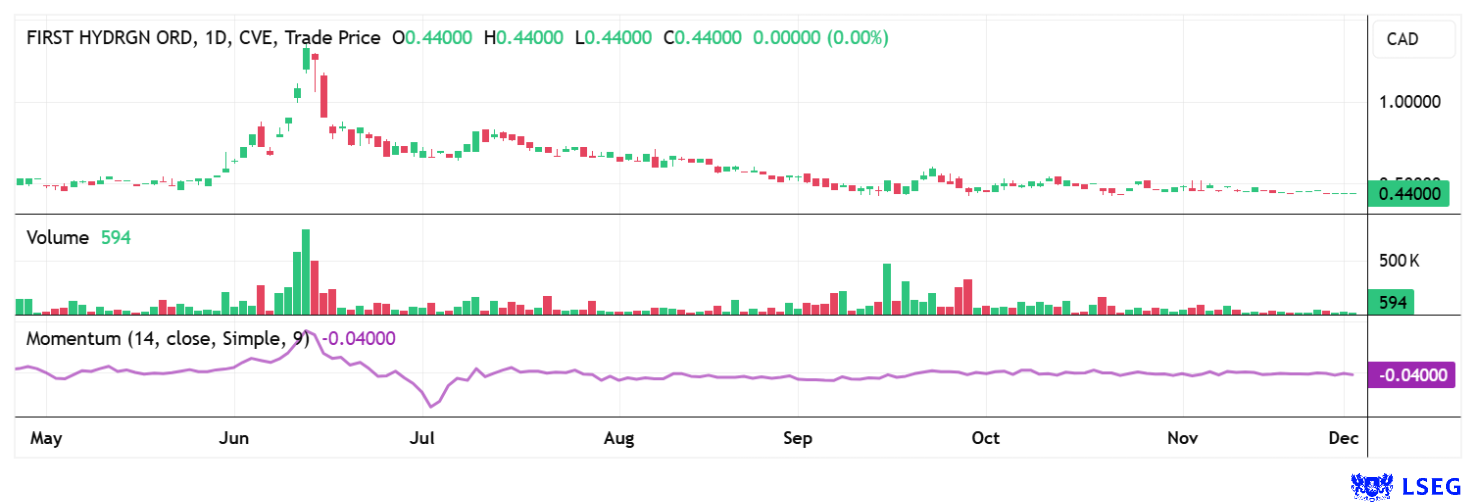 Die Aktie von First Hydrogen (FHYD) konsolidiert derzeit bei 0,40 bis 0,50 CAD, was das innovative Unternehmen mit nur 33 Mio. CAD bewertet. Charttechnisch könnte der Titel sehr schnell wieder Richtung 1,50 CAD anziehen, wie der folgende Chart verdeutlicht. Dynamische Investoren nutzen das volatile Jahresende zum Positionsaufbau!