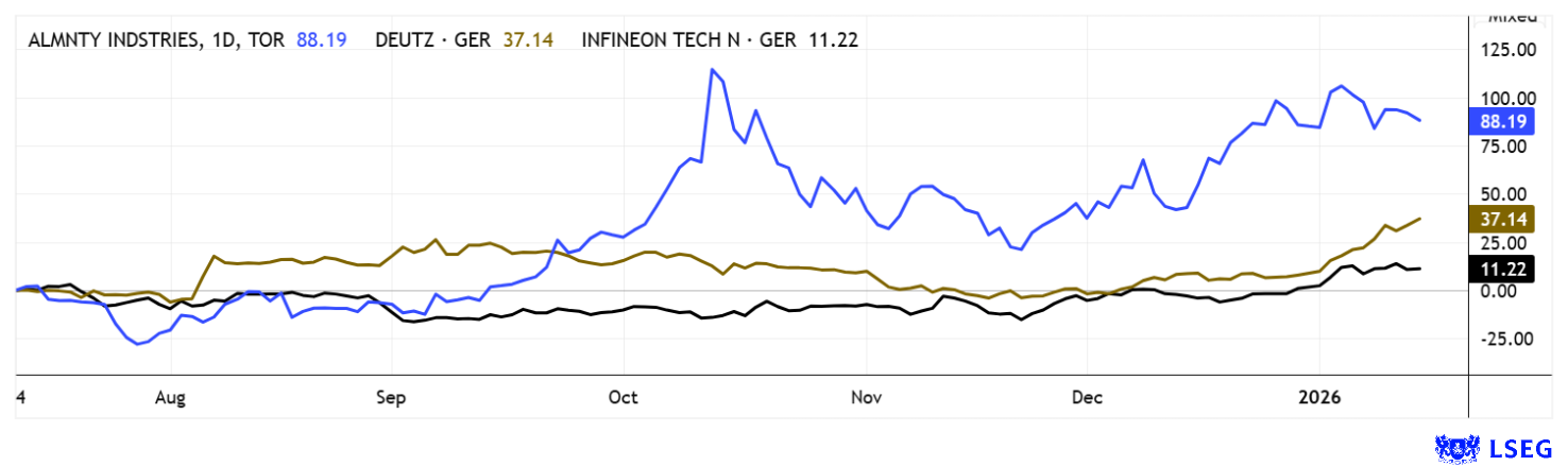 Trotz hoher Volatilität stehen die Gewinner von 2025 auch in 2026 wieder im Rampenlicht. Für Unternehmen wie Almonty Industries manifestiert sich die Position im Sektor kritischer Metalle immer deutlicher. Denn Regierungen haben ein hohes Interesse, westliche Quellen zu schützen und zu fördern. Ähnlich verhält es sich mit den Technologie-Schmieden Deutz und Infineon. Sie sind seit Jahren im Vergleich zu US-Unternehmen stark unterbewertet. Dieser Malus könnte sich in 2026 jedoch allmählich beheben.