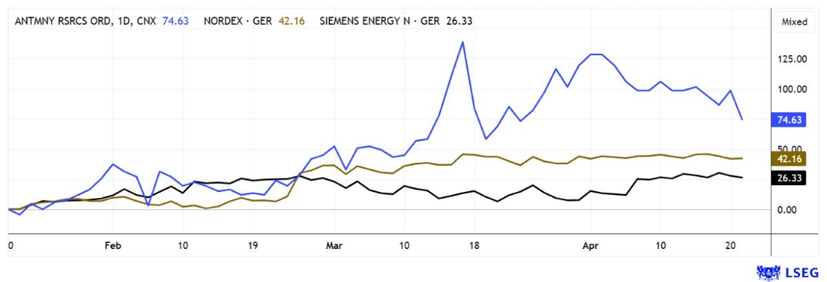 Anleger haben anspruchsvolle Zeiten erlebt. Globale Märkte bleiben von deutlichen Schwankungen geprägt, da die Entscheidungen und Aussagen von US-Präsident Donald Trump weiterhin großen Einfluss auf das globale Geschehen ausüben. Wie viele andere Rohstoffe gilt auch Antimon als ein zentrales Metall für die Hightech- und Verteidigungsbranche. Sollte die Straße von Hormus nicht zeitnah wieder uneingeschränkt passierbar sein, könnten in Teilen der westlichen Wirtschaft ernsthafte Produktionsunterbrechungen entstehen. In einem solchen Umfeld dürfte Antimony Resources verstärkt das Interesse von Investoren wecken, da das Unternehmen als zukünftiger Baustein zur Stabilisierung westlicher Lieferketten gesehen wird. Bei Nordex und Siemens Energy werden die nächsten Quartalsergebnisse zeigen müssen, ob der kräftige Kurszuwachs auch auf mittlere Sicht gerechtfertigt ist.