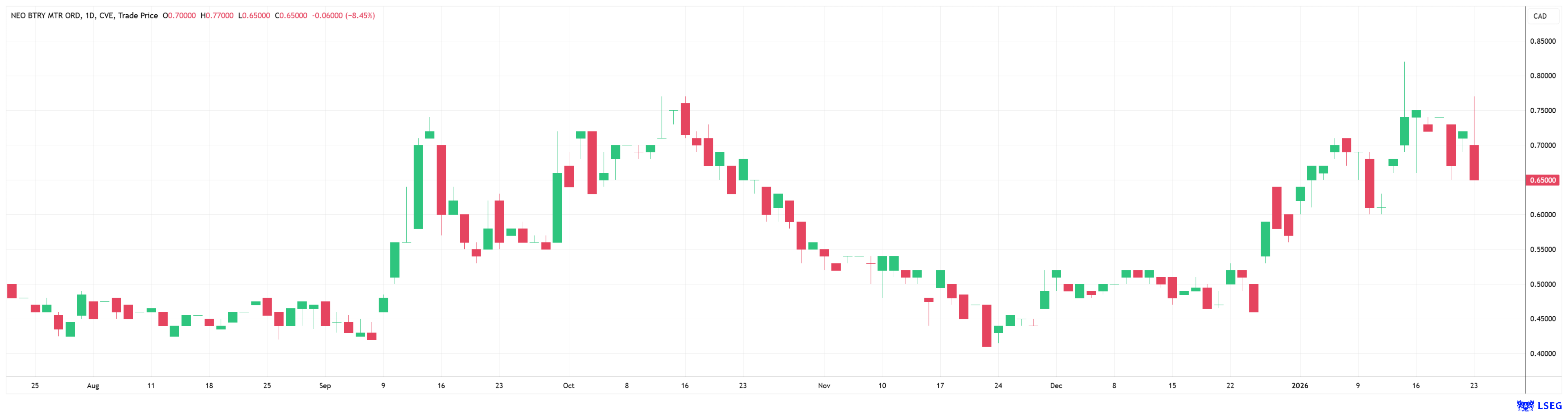 Das mit rund 92 Mio. CAD bewertete Unternehmen hat den Übergang von der Entwicklungsphase in die Kommerzialisierung bereits eingeleitet. NEO arbeitet mit mehreren Fortune-500-OEMs aus Asien und Nordamerika zusammen. Erste kommerzielle Lieferungen stehen im Rahmen laufender Qualifizierungs- und Pilotprogramme an. Darüber hinaus bestehen mehrjährige Liefervereinbarungen mit einem Gesamtvolumen von rund 10 Mio. CAD im Bereich Hochleistungsbatterien für Drohnen- und Robotikanwendungen.