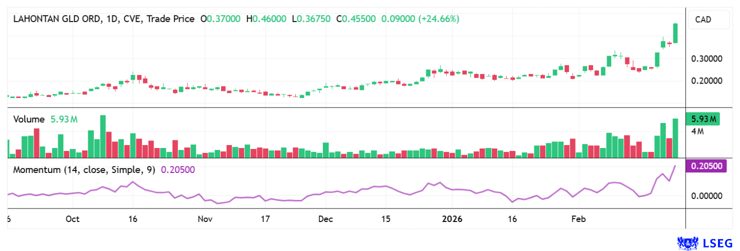 Vor dem Hintergrund steigender Goldpreise gewinnt Lahontans Strategie nun zusätzlich an Hebelwirkung. Große Produzenten wie Barrick oder Newmont stehen unter Druck, ihre Reserven zu ersetzen, ohne die Kostenstruktur aus dem Ruder laufen zu lassen. Projekte wie Santa Fe und West Santa Fe erfüllen genau dieses Anforderungsprofil. Damit entwickelt sich Lahontan Gold nicht nur zu einem eigenständigen Entwickler, sondern auch zu einem potenziellen Übernahmekandidaten im fortschreitenden Konsolidierungsprozess der Branche. Die Aktie konnte mit den letzten News binnen weniger Tage von 0,28 auf 0,45 CAD zulegen, die aktuelle Marktkapitalisierung steigt auf über 150 Mio. CAD. Anscheinend haben hier schon einige Investoren den Bleistift gespitzt. Die Rally dürfte durch die exzellenten Bohrergebnisse zügig weitergehen.