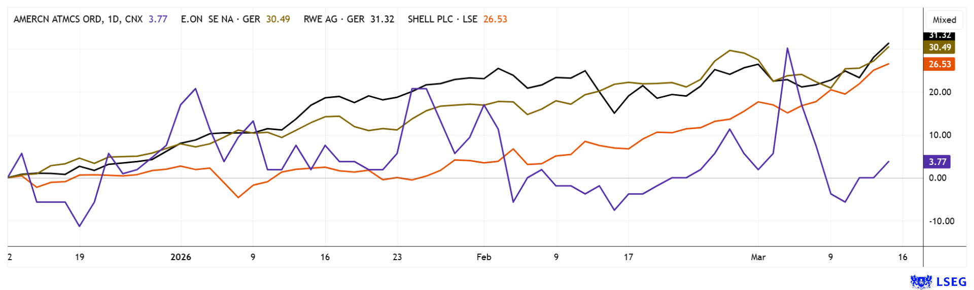 AMERICAN ATOMICS INC | CA0240301089 , ROYAL DUTCH SHELL A EO-07 | GB00B03MLX29 , Shell PLC | GB00BP6MXD84 , E.ON SE NA O.N. | DE000ENAG999 , RWE AG INH O.N. | DE0007037129