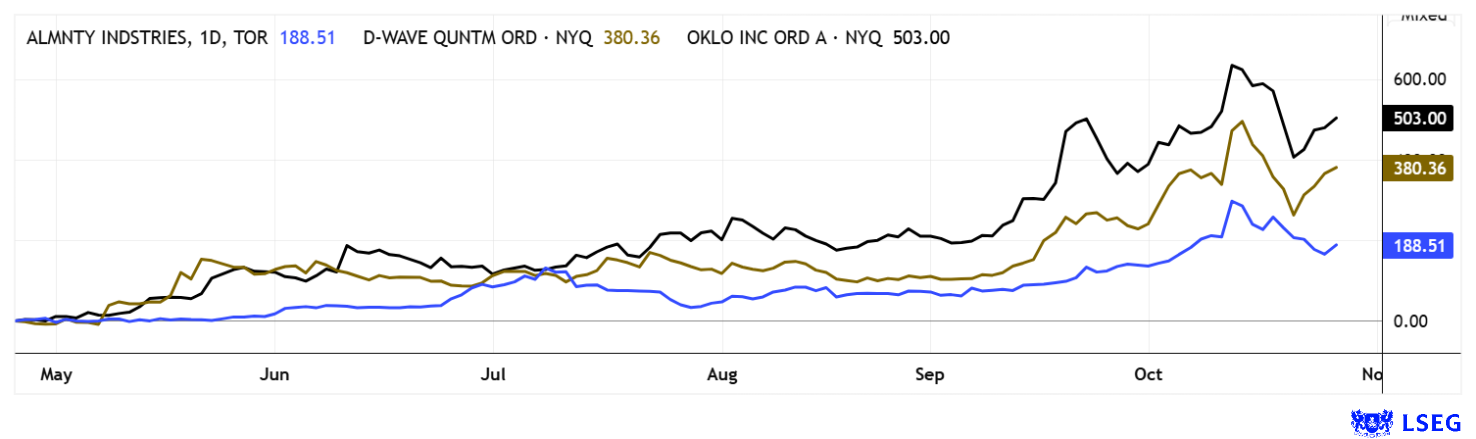 Die Superhausse an den Wachstumsbörsen geht weiter. So könnte auch die Konsolidierung im Sektor „Kritische Metalle“ bereits wieder ausgestanden sein. Starke Gegenbewegungen gab es gestern bei Almonty Industries und den Technologie-Titeln Oklo und D-Wave. Wenn das Momentum tatsächlich wieder nach oben dreht, stehen sehr schnell neue Höchstkurse an!