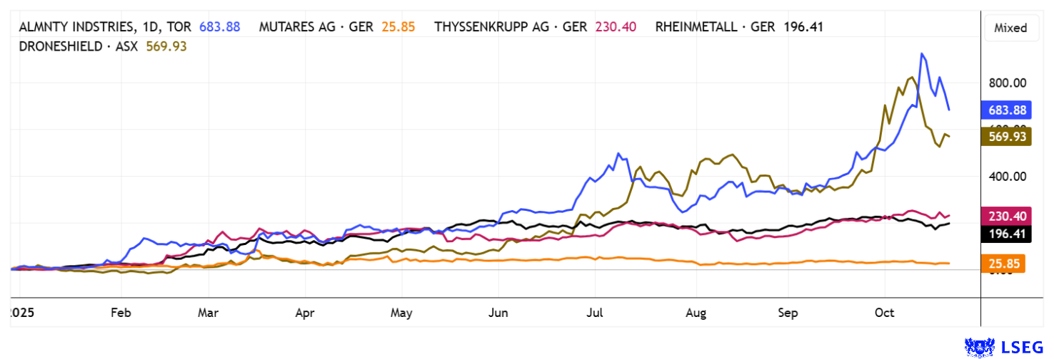 ALMONTY INDUSTRIES INC. | CA0203987072 , THYSSENKRUPP AG O.N. | DE0007500001 , TKMS AG & CO KGAA | DE000TKMS001 , HENSOLDT AG INH O.N. | DE000HAG0005 , MUTARES KGAA NA O.N. | DE000A2NB650
