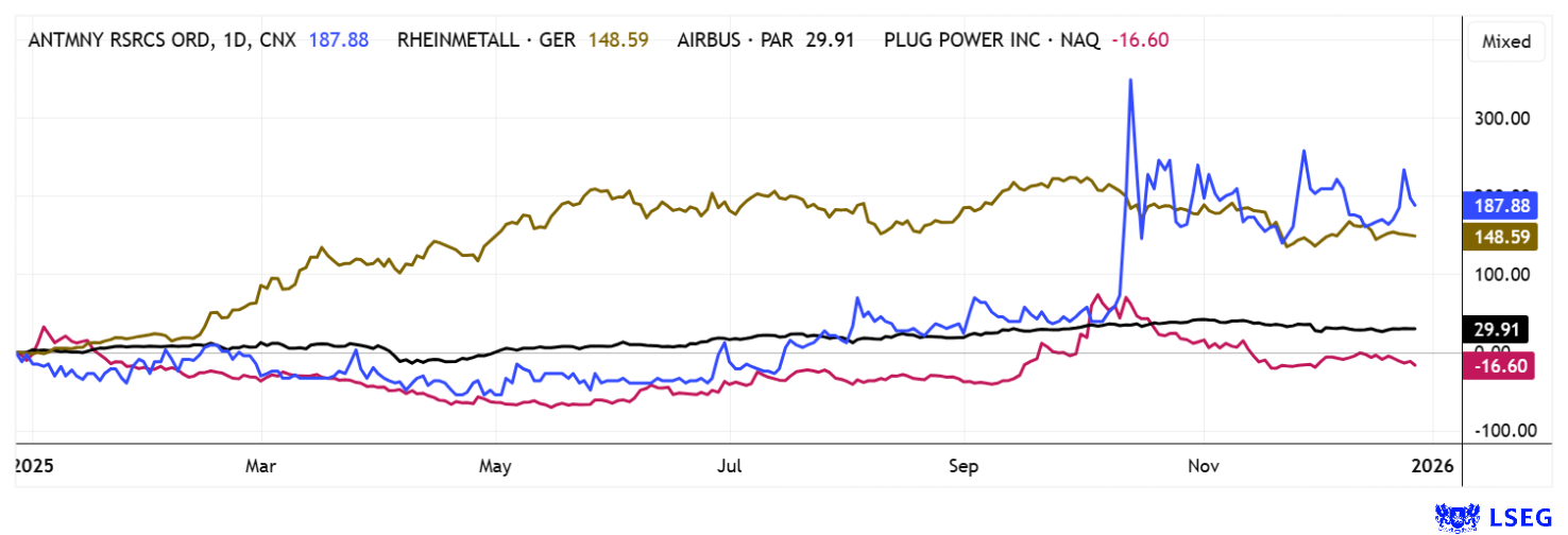 Doch kein Frieden in der Ukraine? Die Rüstungsaktien werden hin- und her befördert wie heiße Kartoffeln, keiner möchte scheinbar investiert sein, wenn die Friedensflagge gehisst wird. Gestern ging es mit dem Defense-Sektor zeitweise um 4 % nach unten, Rheinmetall sank sogar unter die 1.500 EUR-Marke. Als dann enttäuschende Interviews mit Donald Trump aus Florida eintrafen, drehten die Titel wieder nach oben. Fakt bleibt, für den Rüstungs-Sektor braucht es kritische Metalle. Industrie-Riese Airbus kann sich eine Reihe neuer Aufträge sichern und bei Plug Power verschieben sich die Ziele immer weiter nach hinten. Steht wieder eine Kapitalerhöhung im Raum? Aussichtsreich bleibt Antimony Resources, denn die Kanadier besitzen das, was Donald Trump gerne hätte. Beurteilen Sie selbst!