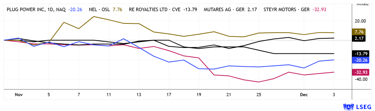 RE ROYALTIES LTD | CA75527Q1081 , STEYR MOTORS AG | AT0000A3FW25 , MUTARES KGAA NA O.N. | DE000A2NB650 , PLUG POWER INC. DL-_01 | US72919P2020 , NEL ASA NK-_20 | NO0010081235